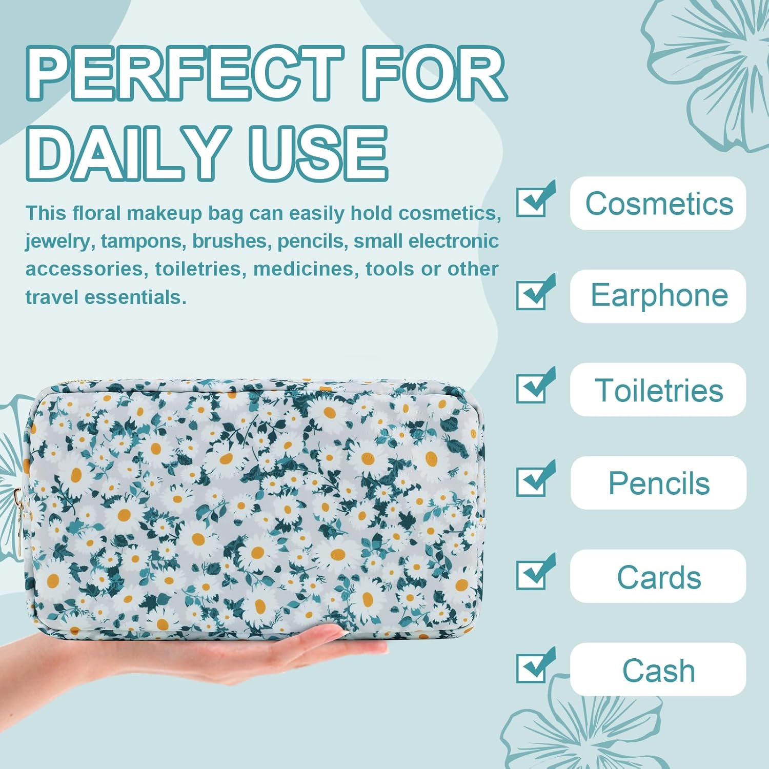 Waterproof Small Floral Makeup Bag Pouch for Purse,Nylon Flower Cosmetic Bag Preppy Travel Toiletry Storage Bag for Women Girl,Cute Makeup Organizer Bag Skincare Bag with Zipper(Small Green-Daisy)