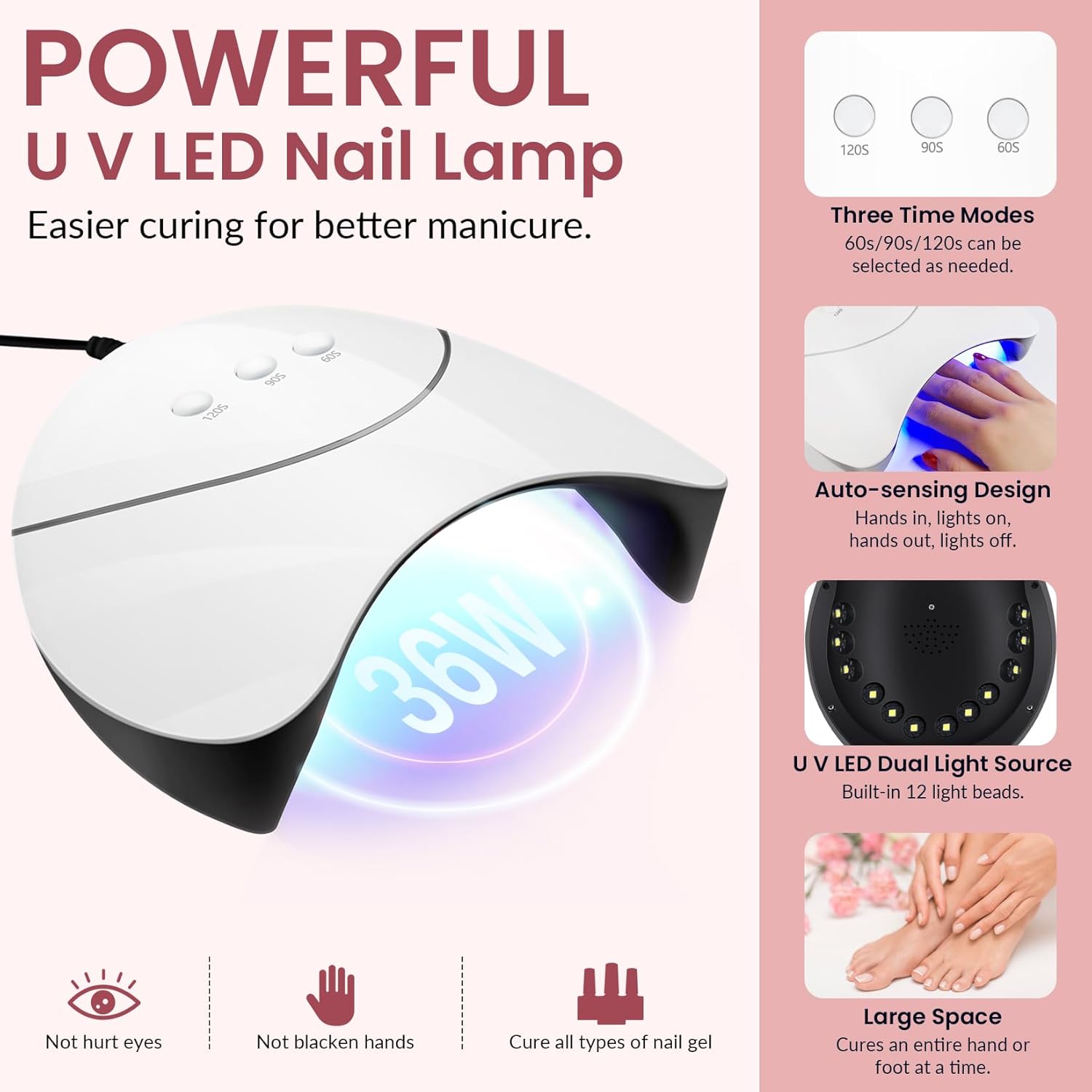 - 【Auto Sensor U V/LED Nail Lamp】 Professional nail light in this gel nail polish kit has three time options: 60s/90s/120s, and automatic sensor design, allowing you to easily control the curing of gel nail polish. U V/LED dual light source design, with 12 lamp beads, can efficiently cure almost all kinds of nail gel, not hurt your eyes, not black hands. Enough space to cure a whole hand or foot, bring you high quality nail art curing experience.