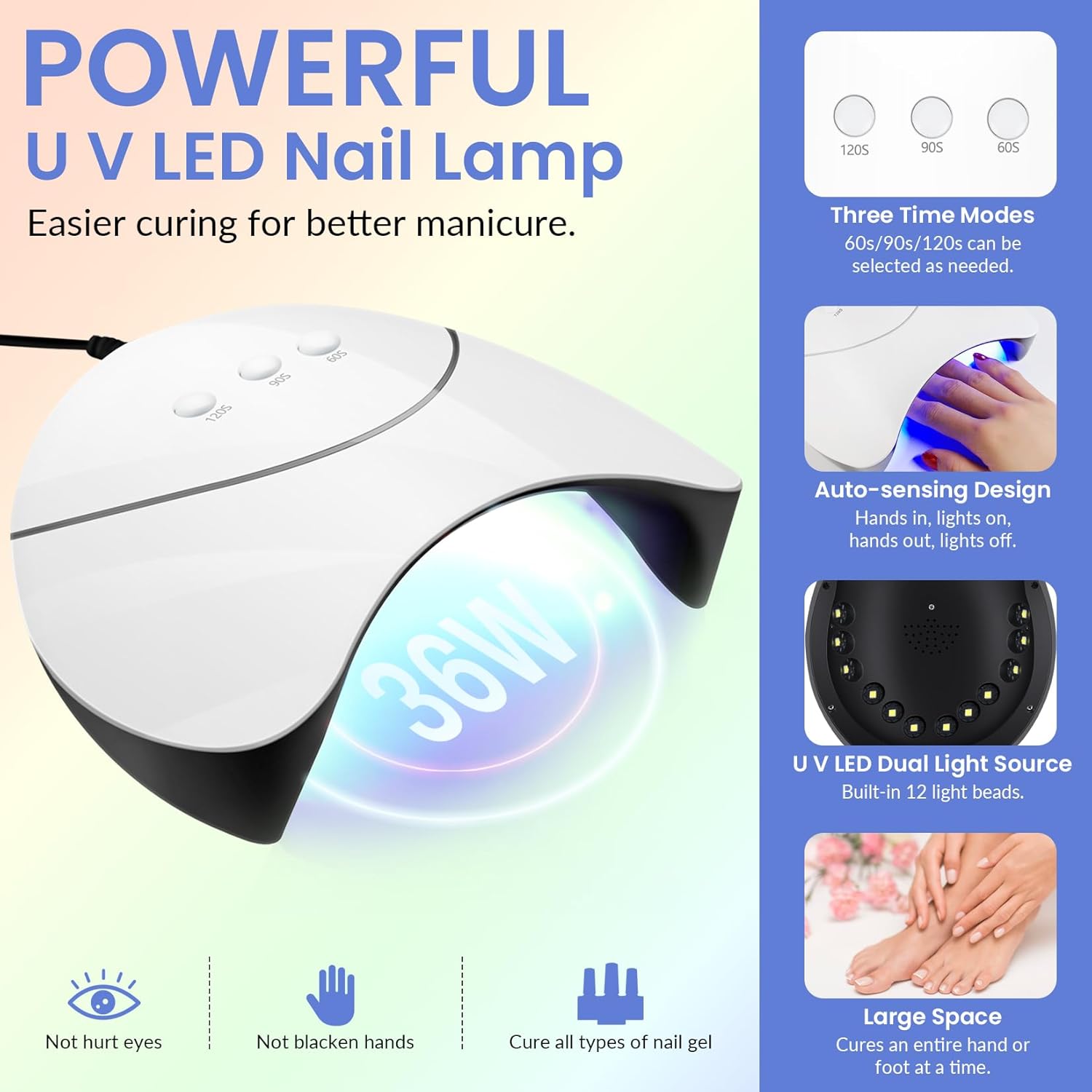 - 【Powerful U V/LED Nail Lamp】 Professional nail light in this gel nail polish kit has three time options: 60s/90s/120s, and automatic sensor design, allowing you to easily control the curing of gel nail polish. U V/LED dual light source design, with 12 lamp beads, can efficiently cure almost all kinds of nail gels, not hurt your eyes, not black hands. Enough space to cure a whole hand or foot, bring you high quality nail art curing experience.